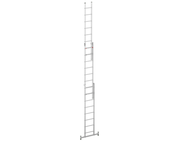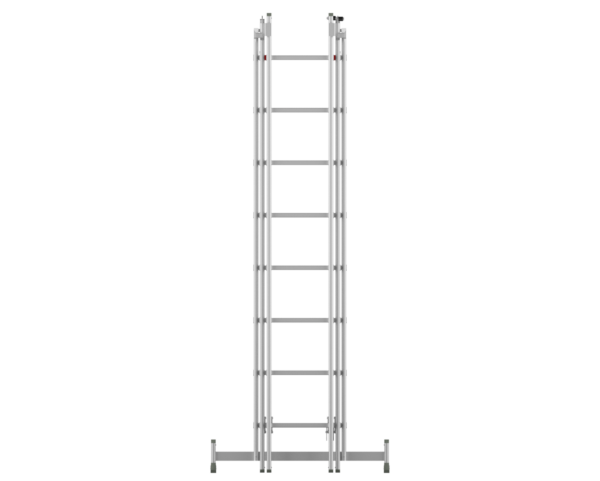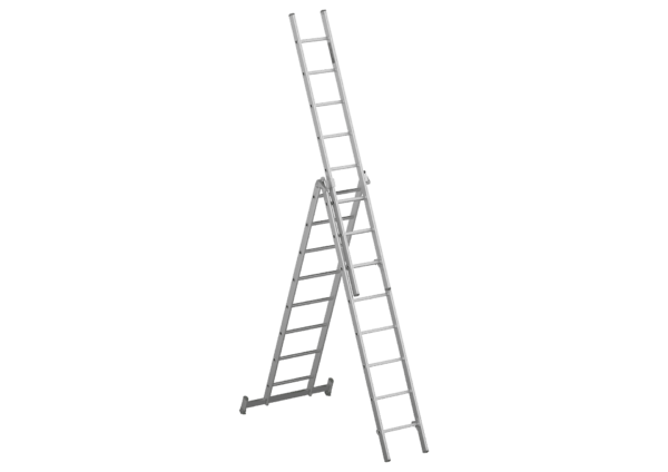 Dreiteilige Mehrzweckleiter aus Aluminium (Schiebe- und Dreifachleiter) – stabil auf allen Untergründen. Sprossen 25 x 25 mm – Aluminiumguss-Scharniere – Stranggussprofil – Sicherheitsverriegelung – nicht abfärbende, rutschfeste Fusskappen.Verfügbar mit 6 bis 12 Sprossen für Zugangshöhen von 1,80 bis 7,98 Metern.