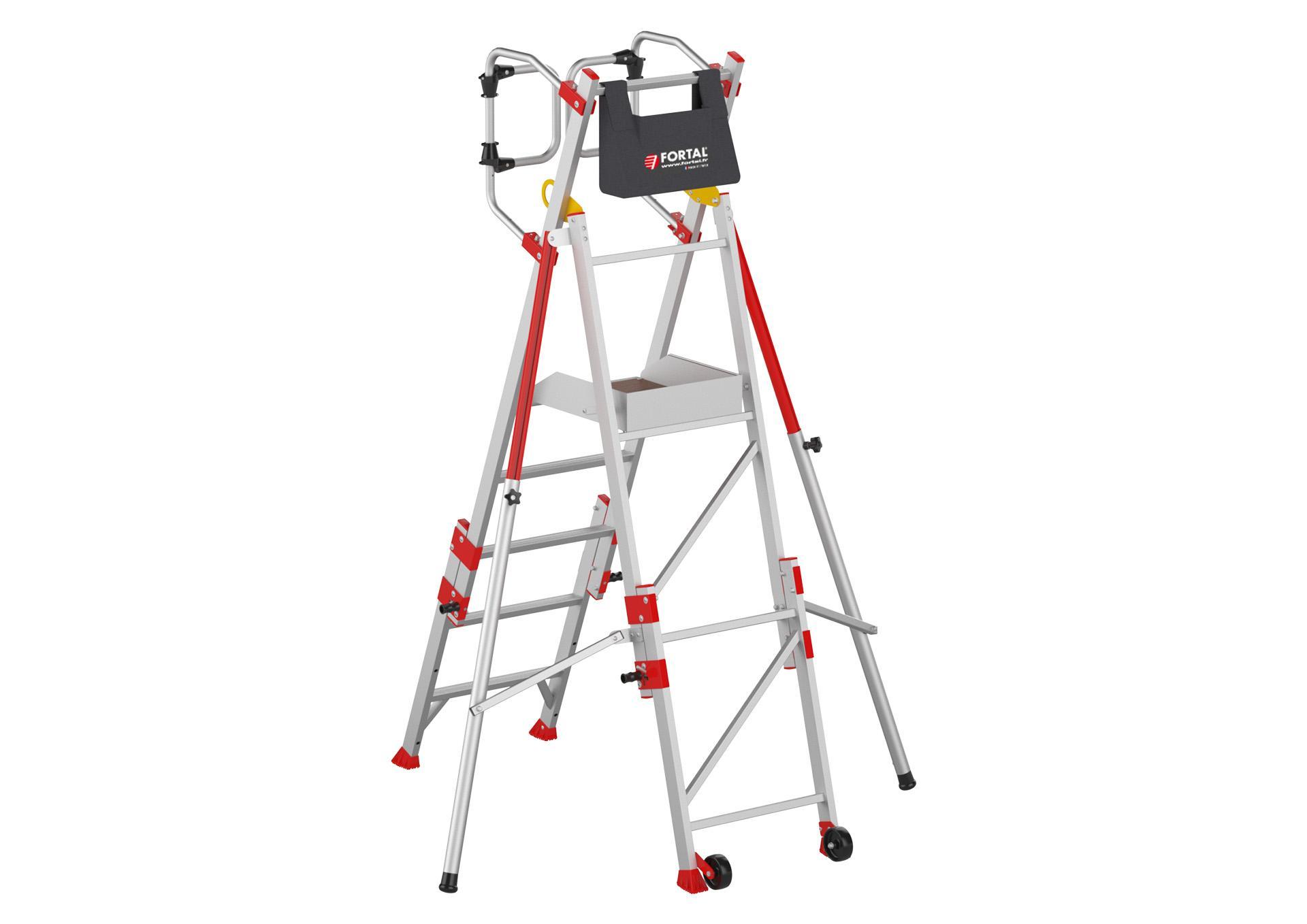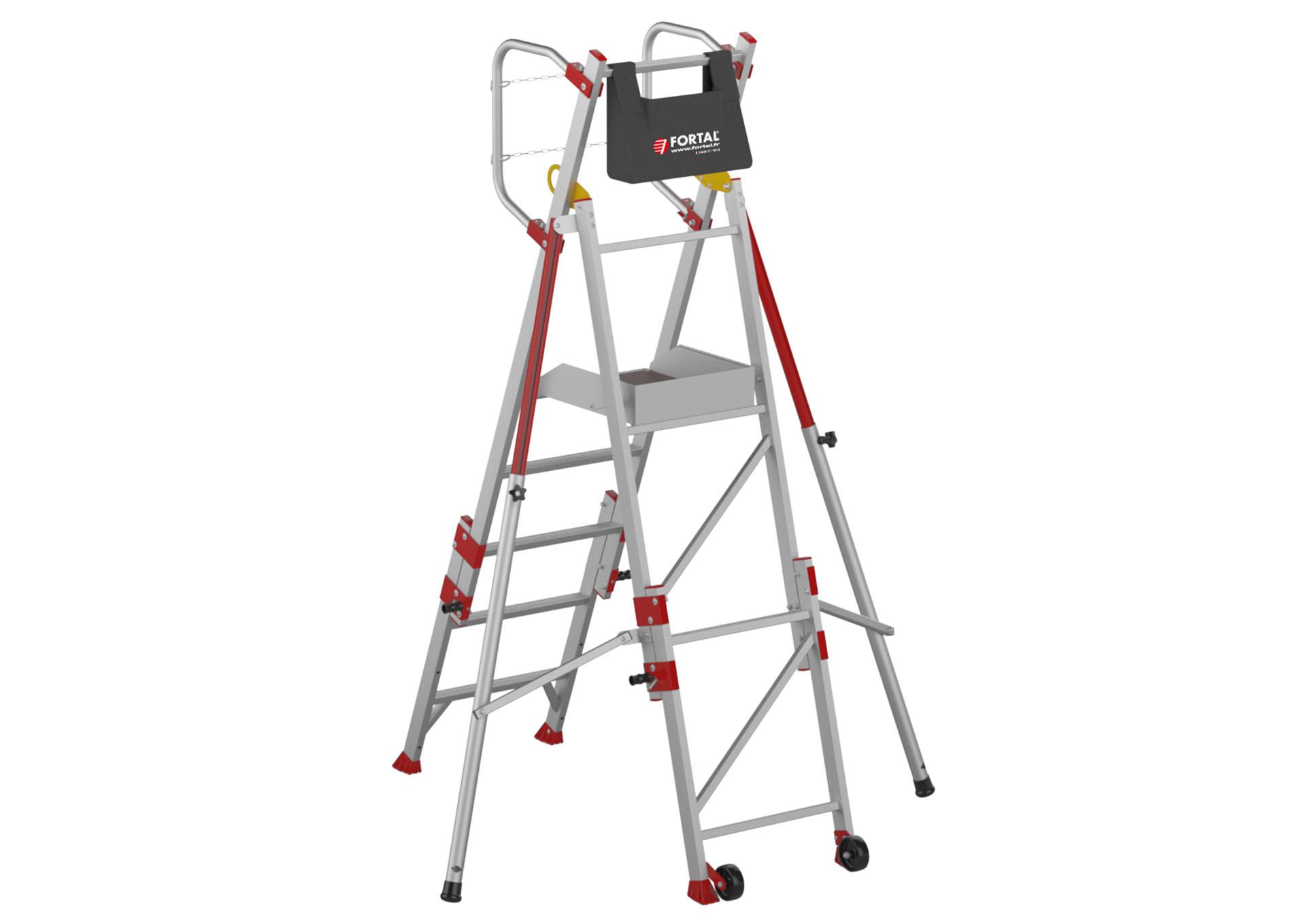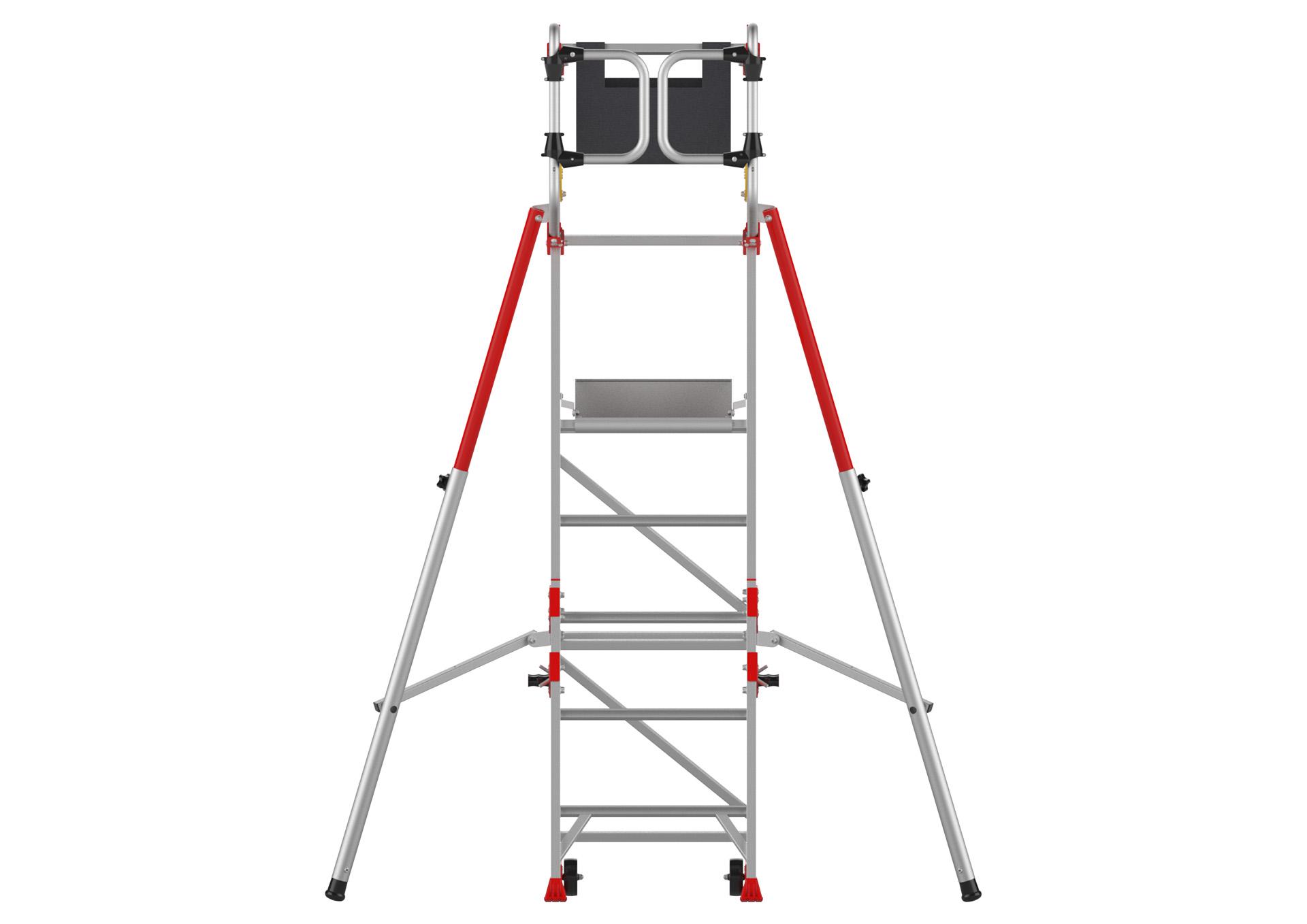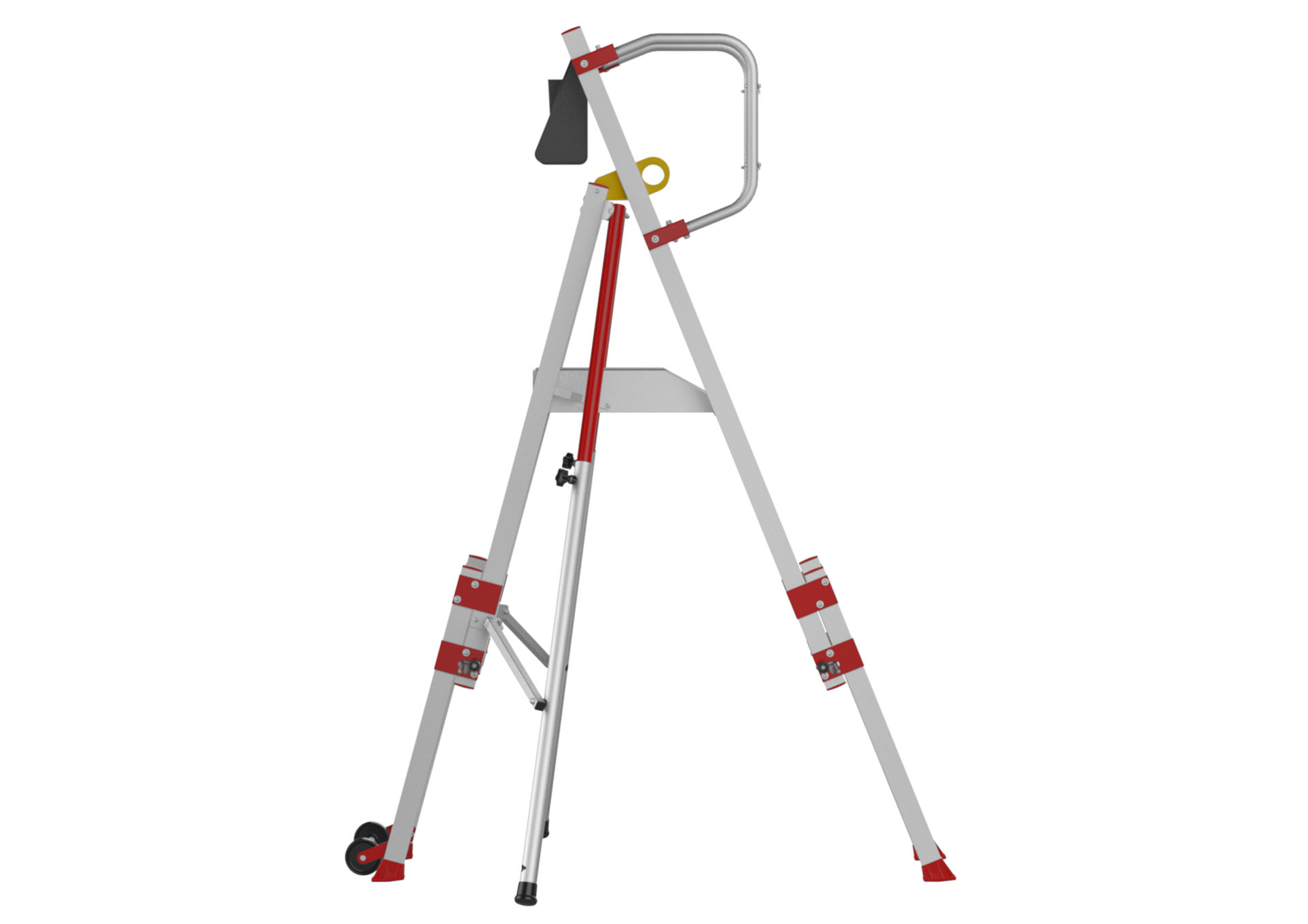 Fahr, klappbare- und in höhe verstellbare Plattform, einseitiger Zugang. Struktur aus Aluminium (neues geriffeltes Profil 55 x 25 mm). Mit einer einfachen und schnellen Handbewegung stellen Sie die Plattform durch ein neues, innovatives und ergonomisches System auf die richtige Arbeitshöhe ein. Gleichzeitiges Bedienen und Entriegeln reduziert das Risiko von Muskel-Skelett-Erkrankungen und vermeidet Verletzungen an den Händen. Leicht zu bewegen dank der 2 Rollen Ø 100 mm (Modelle 2 bis 4 Stufen und 3 bis 5 Stufen) oder Ø 160 mm (Modelle 4 bis 7 Stufen und 6 is 10 Stufen) – nicht aufstehend in Arbeitsposition – besonders für den Bau geeignet und der Kranringe. Arbeitsplattform aus Mehrschichtholz (9 mm Stärcke), rutschfest, austauschbar und mit bequemer Größe: 413 x 479 mm mit Fuβleisten. Rutschfeste Aluminiumstufen, Tiefe 60 mm. Sicherer Gebrauch mit 2 klappbaren Teleskopausleger aus Aluminium (auβer Modell 2 bis 4 Stufen). Rutschfeste Fuβkappen mit groβer Bodenkontaktfläche für mehr Stabilität. AbnehmbareTextil-Werkzeugtasche, austauschbar. Verfügbar in vier Modellen : 2 bis 4 Stufen – 3 bis 5 Stufen – 4 bis 7 Stufen und 6 bis 10 Stfen für Arbeitshöhen von 1.50 bis 4.50 Metern. Erhältlich in zwei Versionen: Gelenkgeländer mit Doppeltürverschluss und automatischer Rückstellung für mehr Sicherheit und bessere Ergonomie oder mit Kettenverschluss.Konformität EN 131.