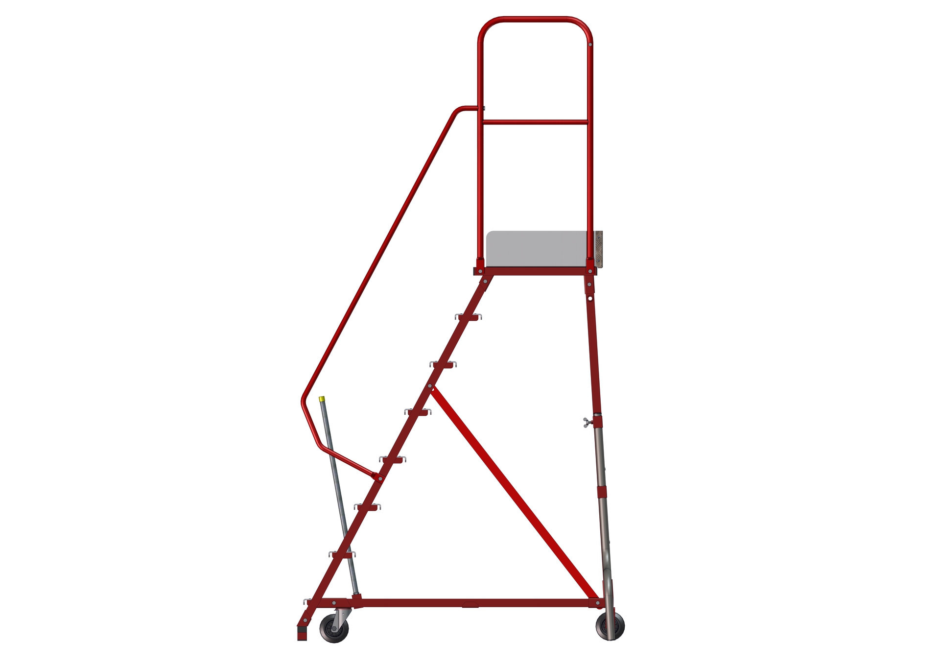 Plattformleiter, einseitiger Aufstieg, für den intensiven Einsatz in diverse Arbeiten sowohl im Innen- als auch im Aussenbereich. Stahlkonstruktion, rot-thermolackiert. Geländer auf 3 Seiten der Plattform, Handlauf rechts und links für mehr Sicherheit für den Benützer. Grosse Stabilität dank den Aluminium-Ausleger: schwenkar oder teleskopisch je nach Model. Einfache Bewegung mit Hebelsystem. Verfügbar von 3 bis 15 Stufen für Arbeitshöhen von 2.60 bis 5.00 Meter.Konform EN 131-7.